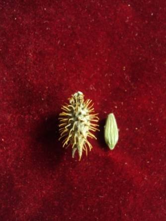 Ovoid, 1.6 cm long with 2-erect beaks, thickly clothed prickles, hard and tough. |