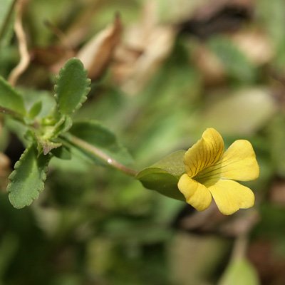 Yellow flowers in leaf axils, four petals with reddish lines entering the throat. The upper petal 2 joined petals. 3 lower petals, and 3 green bracts at their base |