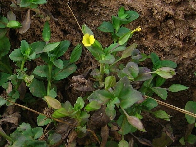 Yellow flowers in leaf axils, four petals with reddish lines entering the throat. The upper petal 2 joined petals. 3 lower petals, and 3 green bracts at their base. |