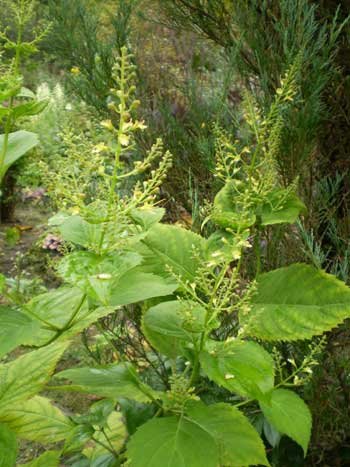 Leaves -large, coarsely serrated, ovate, acuminate, lower ones petiolate, upper ones nearly sessile. |