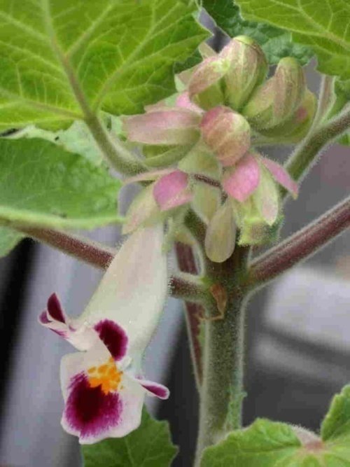 Erect, widely branched, vicid, densely, glandular-long-hairy, annual herb or slender shrub. Stem fistular, purplish green, sticky. |